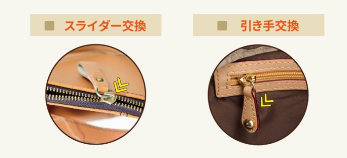 頻繁な開け閉めで傷みやすいファスナー。テープ部分(生地)が切れたり金属ファスナーの金具が外れてしまっても、新しいファスナーに交換することができます。