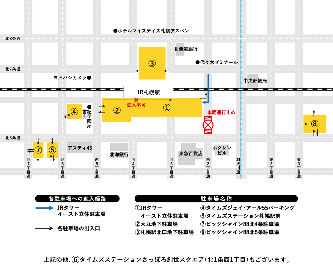 2026年4月1日(水)より、西2丁目通の車両通行止めに伴い、JRタワーイースト立体駐車場の入出場ルートが変更となりました。